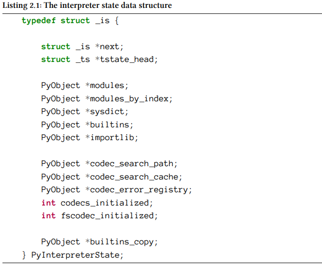 인터프리터와 쓰레드 상태에 대한 데이터 구조를 보면 그 데이터 구조의 함수에 일부 context를 제공한다. 인터프리터와 스레드 상태는 그저 프로그램의 실행에 요구돠는 정보를 유지하는 field의 포인터를 가지는 구조이다. 인터프리터 상태 typedef(c 용어의 타입 정의라고 가정한다)